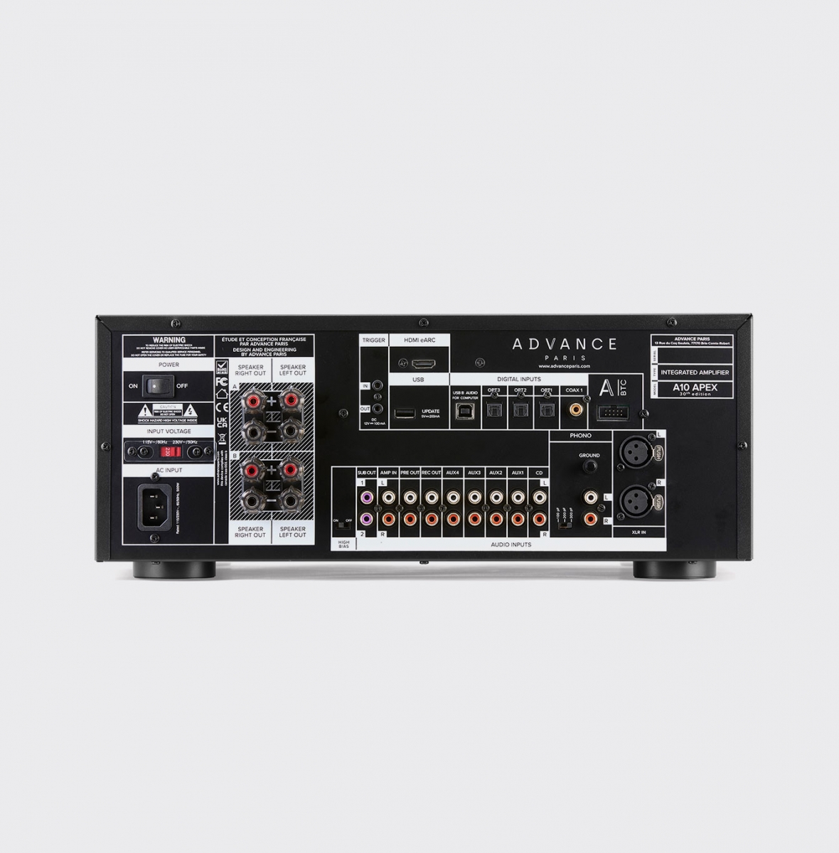 cuümbuizen staan bekend om hun warme, muzikale karakter, maar missen vaak de dynamiek en het hogere vermogen van Klasse AB-versterking. Advance Paris kiest daarom voor een hybride benadering: in het voorversterkergedeelte worden vacuümbuizen toegepast voor een verfijnde klankweergave, terwijl het eindversterkergedeelte gebruikmaakt van krachtige Klasse AB-technologie. De eindversterker van de A10 APEX levert 2 x 130 watt bij 8 Ohm en 2 x 198 watt bij 4 Ohm een stevig vermogen om luidsprekers goed aan te sturen en onder controle te houden.